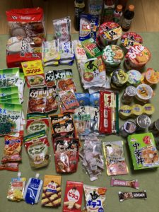 カップ麺、パスタ、マカロニ、そうめん、うどん、ゼリー、くだもの缶詰、ツナ缶詰、コーン缶詰、