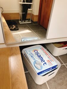 我が家は玄関の下駄箱の下に、家族分を収納しています。