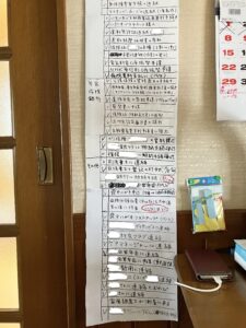 こちらが実際に壁に張り出したチェックリストの画像↓で、最終的には巻物のように長くなりました(笑)