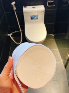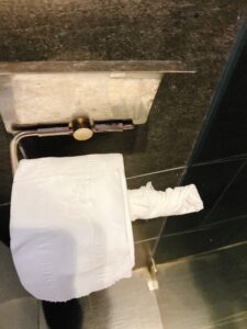 他の場所でもやっぱり、芯なし穴なしペーパーで、大体みんな便器の後ろのタンクの上とかに置いてあったね。あとペーパーのホルダーが、ほぼ背面にあるのも背中つりそう。