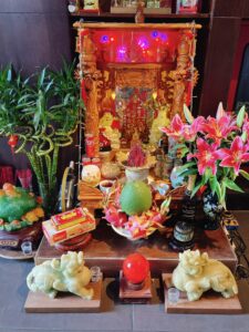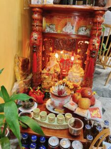 ベトナムのお店に入ると、絶対にこの仏壇が置いてあって、その色や形、置いてあるグッズに驚きまくりなのよ。
