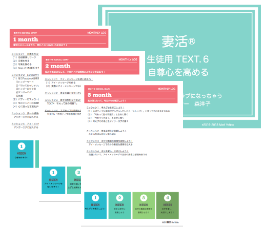 妻活トレーニングのオリジナルテキストを使って学び・練習し・実践します。そして、日々の課題(独自のプログラム)を実践してもらい、毎日記録をつける。その内容から改善点やアドバイスを妻活トレーナーが丁寧にフィードバックします。